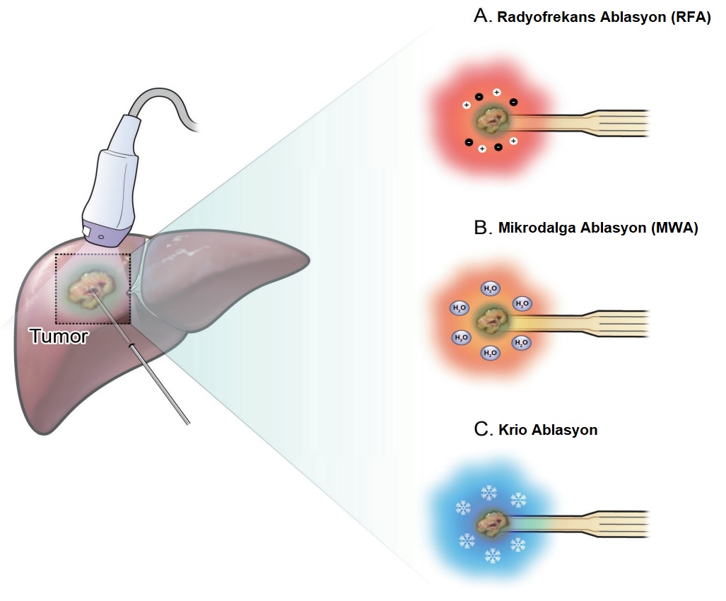 Radyofrekans ablasyon, yüksek frekanslı alternatif akım kullanılarak tümör dokusunda ısı üretir. Elektrot iğneleri aracılığıyla dokulara enerji iletilir ve 60–100°C’ye ulaşan sıcaklıkla hücre ölümüne neden olur. Özellikle karaciğer ve böbrek tümörlerinde etkinliği kanıtlanmıştır.