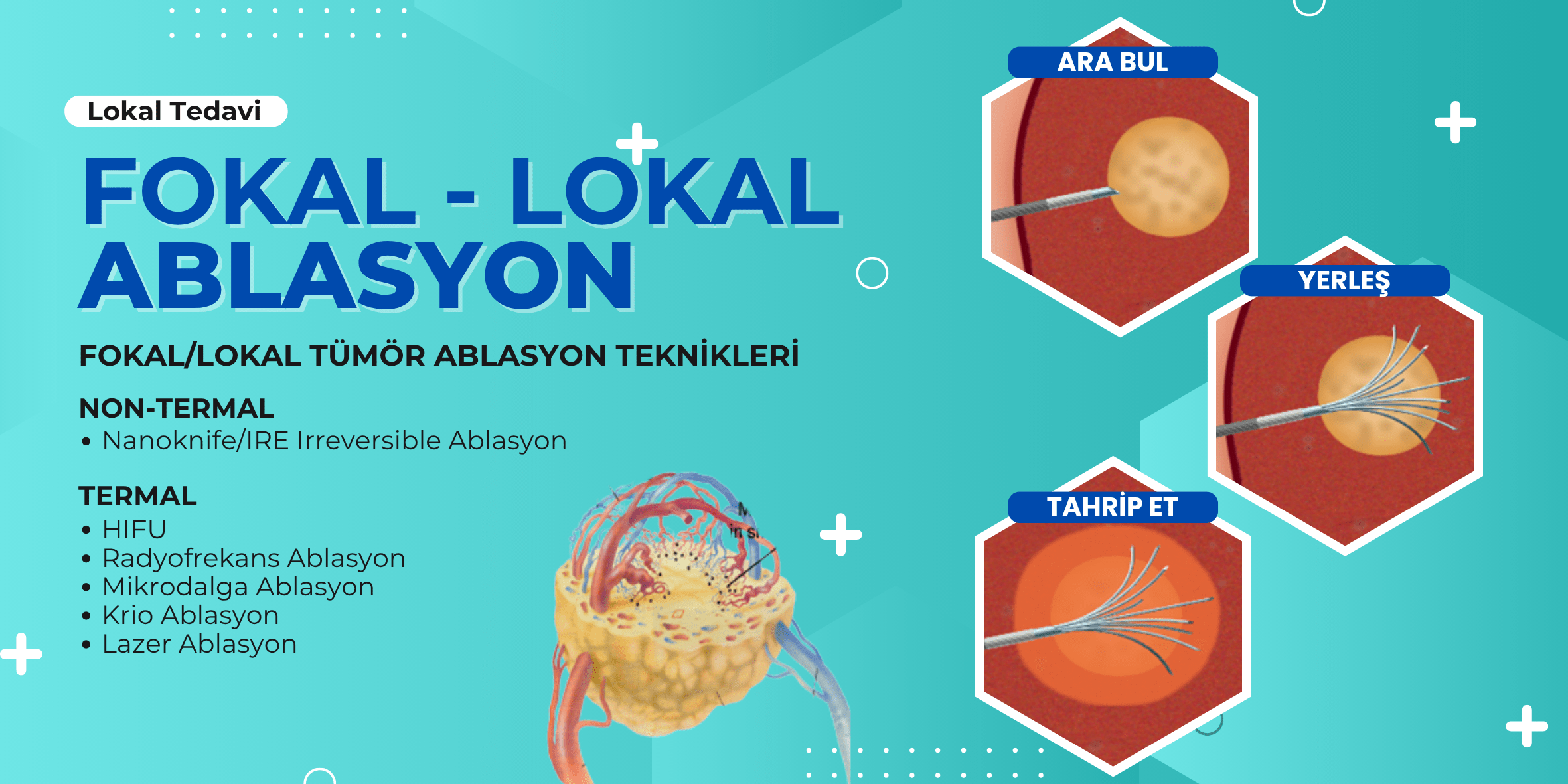 Lokal veya diğer kullanılan tanımıyla Fokal Tümör Ablasyon tedavileri sadece kanser hücrelerini hedef alır, çevre sağlam dokulara zarar vermez.